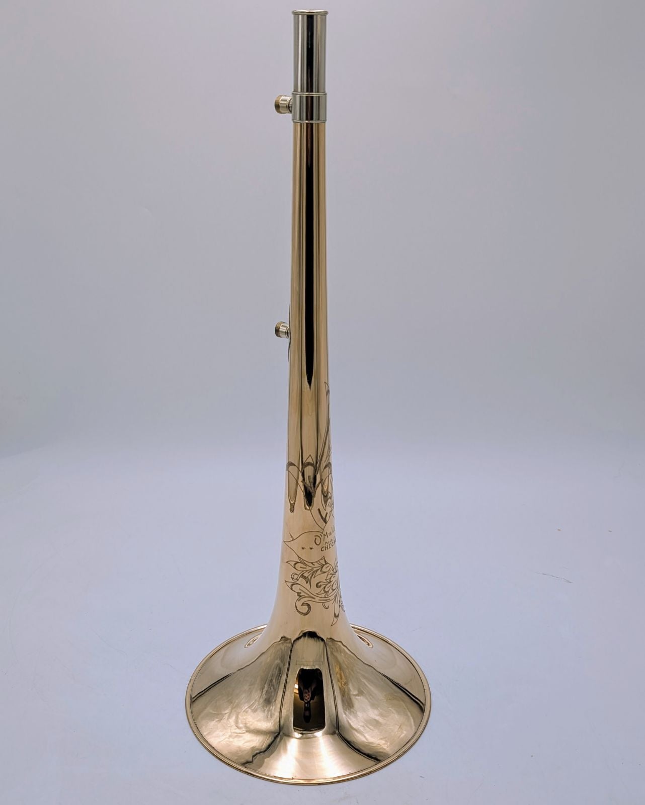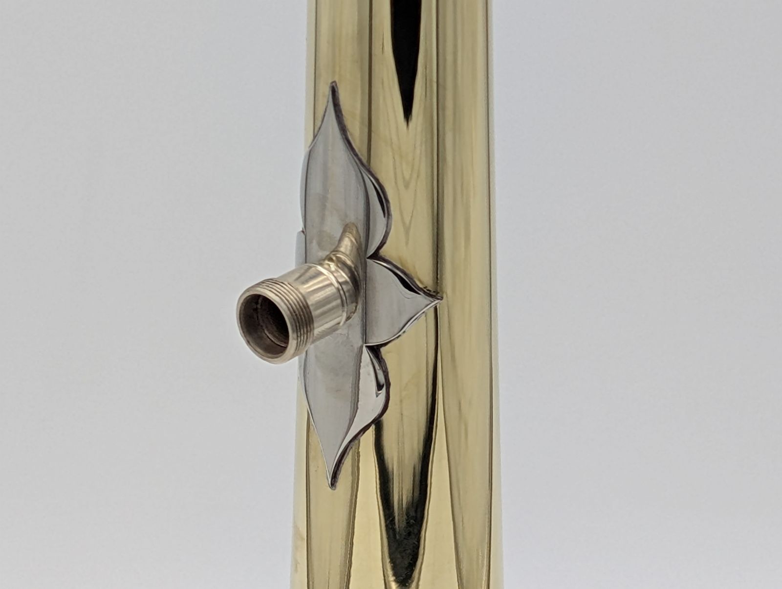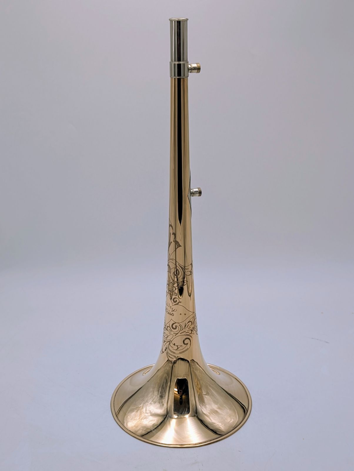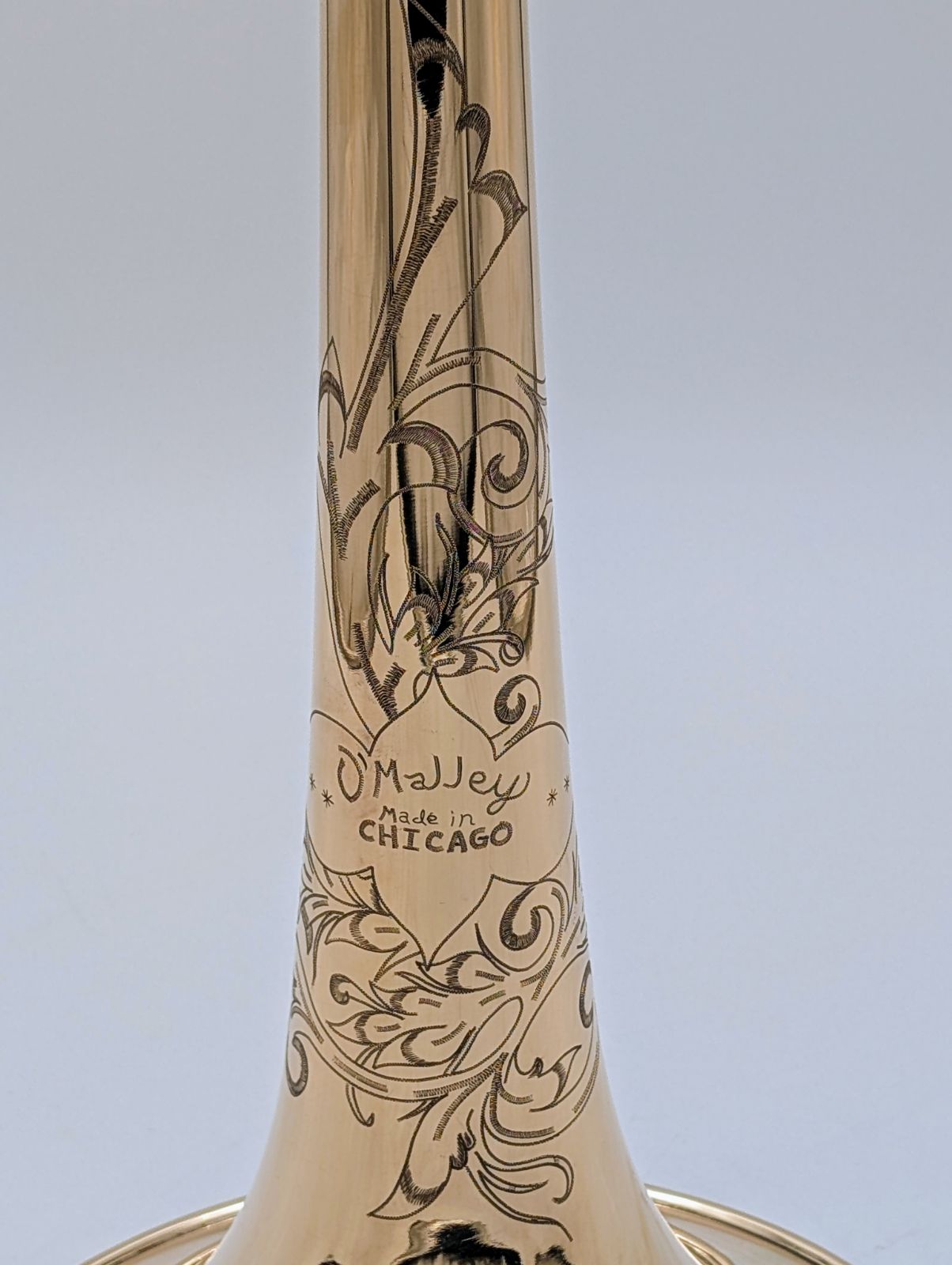 One piece trombone bells handmade in our workshop. We also offer them in 2 piece versions. Available in yellow, gold, or commercial bronze. Sterling silver is also available (special order, call for pricing). These will fit Shires large bore valve sections and tuning slides. All bells will come with the standard O'Malley leaf engraving unless otherwise specified (upgrade to floral engraving is optional).
